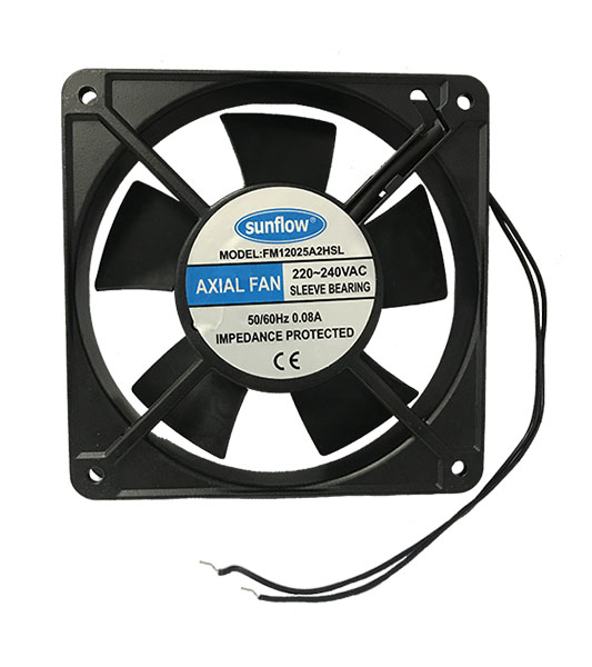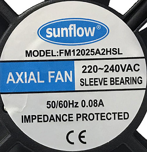 Вентилятор Sunflow FM12025A2HSL — это малогабаритный квадратный осевой вентилятор с габаритами 120х120х25 мм, предназначенный для охлаждения промышленного и бытового оборудования. Он работает от сети переменного тока 220 В с номинальной мощностью около 16 Вт. Модель оснащена пятилопастным вентилятором, обеспечивающим эффективный воздушный поток для охлаждения шкафов управления, кондиционеров и другого оборудования.