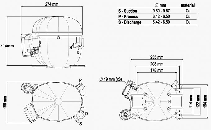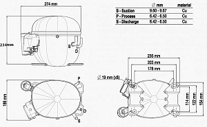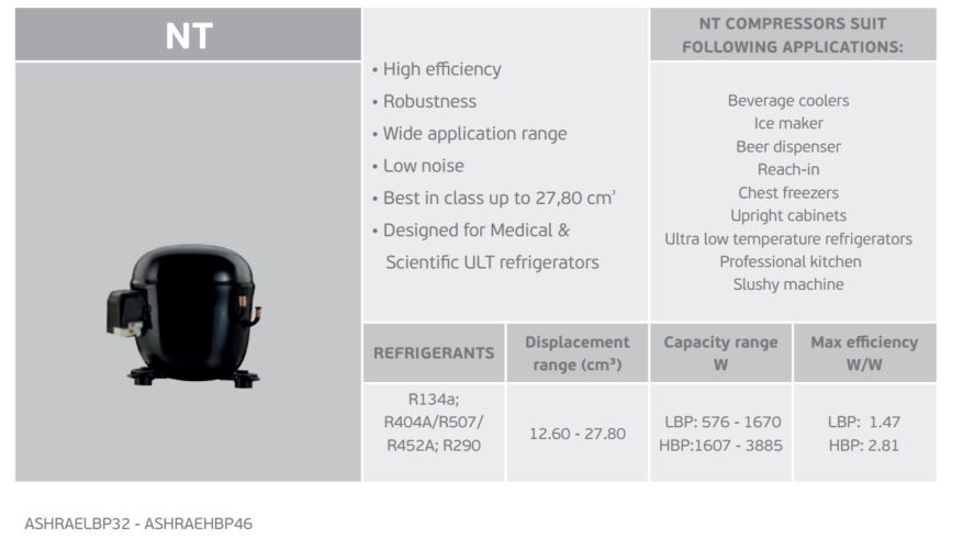 Герметичный холодильный компрессор Embraco Aspera NT2180GK. Холодопроизводительность составляет 0.935 кВт (ASHRAE -23,3 ºC / 54,4 ºC),применяемый хладагент R404/507.В состав комплекта входит: Компрессор, пусковое реле, пусковой конденсатор, крышка, разветвитель проводов, монтажный комплект.