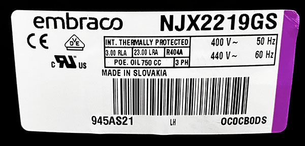 Компрессор Embraco Aspera NJX2219GS — это герметичный поршневой агрегат, предназначенный для низкотемпературного режима (LBP) с диапазоном температур испарения от -40°C до -10°C. Модель работает на трёхфазном напряжении 380-420В и является прямым аналогом компрессора TFH2480Z с пайкой, что делает её удобной заменой при ремонте и обслуживании промышленного холодильного оборудования. Благодаря высокому пусковому моменту (HST) и трёхфазному типу мотора компрессор обеспечивает надёжный запуск и стабильную работу в морозильных камерах, низкотемпературных витринах, бонетах и другом профессиональном оборудовании. Агрегат совместим с хладагентами R404a, R507 и R452a. Производительность модели NJX2219GS: холодопроизводительность по стандарту ASHRAE (при Ти -23.3°C, Тк +54.4°C) составляет 2164 Вт, а по стандарту EN12900 (при Ти -35°C, Тк +40°C) — 1181 Вт. Компрессор оснащён двигателем мощностью 2 1/4 л.с., рабочий объем цилиндра — 38 см³, а вес составляет 21.8 кг. Устройство рассчитано на трёхфазное напряжение 380-420В при частоте 50Гц. Компрессор поставляется под артикулом NJX2219GS и произведён брендом Embraco Aspera, известным своей надёжностью и долговечностью. Полная техническая документация доступна для скачивания. Выбирая NJX2219GS, вы получаете мощное трёхфазное решение для низкотемпературного холодильного оборудования, которое выступает в качестве полноценной замены TFH2480Z, сочетая в себе высокий пусковой момент, отличную производительность и адаптацию к современным хладагентам.
