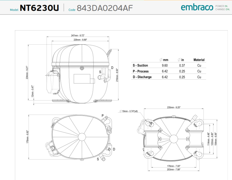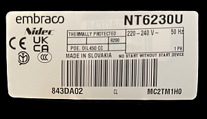 Компрессор Embraco Aspera NT6230U — это герметичный поршневой агрегат, работающий на экологичном хладагенте R290 (пропан). Модель предназначена для среднетемпературного режима (MBP) с диапазоном температур испарения от -20°C до +10°C, что делает её отличным выбором для профессионального среднетемпературного оборудования: холодильных витрин, охлаждаемых столов, гастроемкостей и другого торгового оборудования. Благодаря высокому пусковому моменту (HST) и типу мотора CSR компрессор обеспечивает надёжный запуск и стабильную работу. Производительность модели NT6230U: холодопроизводительность по стандарту ASHRAE (при Ти +7.2°C, Тк +54.4°C) составляет 3620 Вт, а по стандарту EN12900 (при Ти -10°C, Тк +45°C) — 1931 Вт. Коэффициент холодопроизводительности — 2.23 (ASHRAE) и 1.97 (EN12900). Компрессор оснащён двигателем мощностью 1 1/4 л.с., рабочий объем цилиндра — 27.8 см³, а вес — 17.7 кг. Устройство рассчитано на напряжение 220-240В при частоте 50Гц. Тип масла — ISO22. Использование R290 в качестве хладагента обеспечивает высокую энергоэффективность и минимальное воздействие на окружающую среду. Компрессор поставляется под артикулом NT6230U и произведён брендом Embraco Aspera, известным своей надёжностью и долговечностью. Полная техническая документация доступна для скачивания. Выбирая NT6230U, вы получаете производительное и экологичное решение для среднетемпературного холодильного оборудования, сочетающее в себе высокий пусковой момент и адаптацию к современному хладагенту R290.