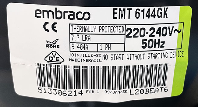 Среднетемпературный, R404a, R507, 679 Вт, 3.97 см3, MBP 7.2°C, -20..10°C, 220-240В, 50Гц