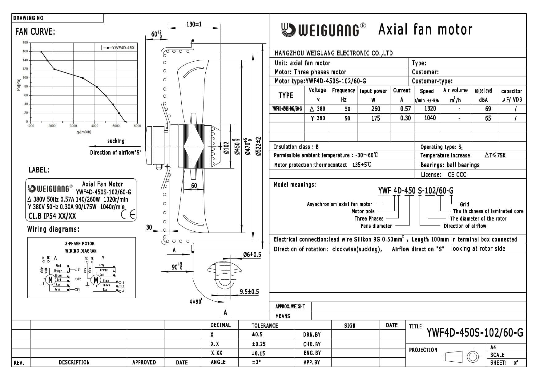 Вентилятор осевой Weiguang YWF4D-450S-102/60-G в сборе с защитной решеткой. Применяются в составе систем вентиляции, кондиционирования, теплообменных аппаратов в холодильной технике. Имеют встроенную защиту электродвигателя, допустимая температура окружающей среды -30...+60 °C, степень защиты IP54. Диаметр ротора - 102 мм, толщина лопасти - 60 мм.